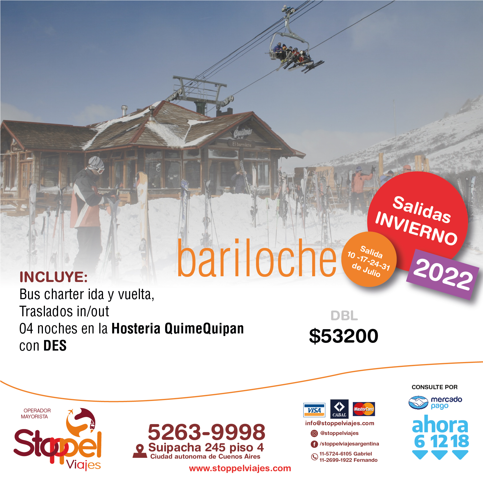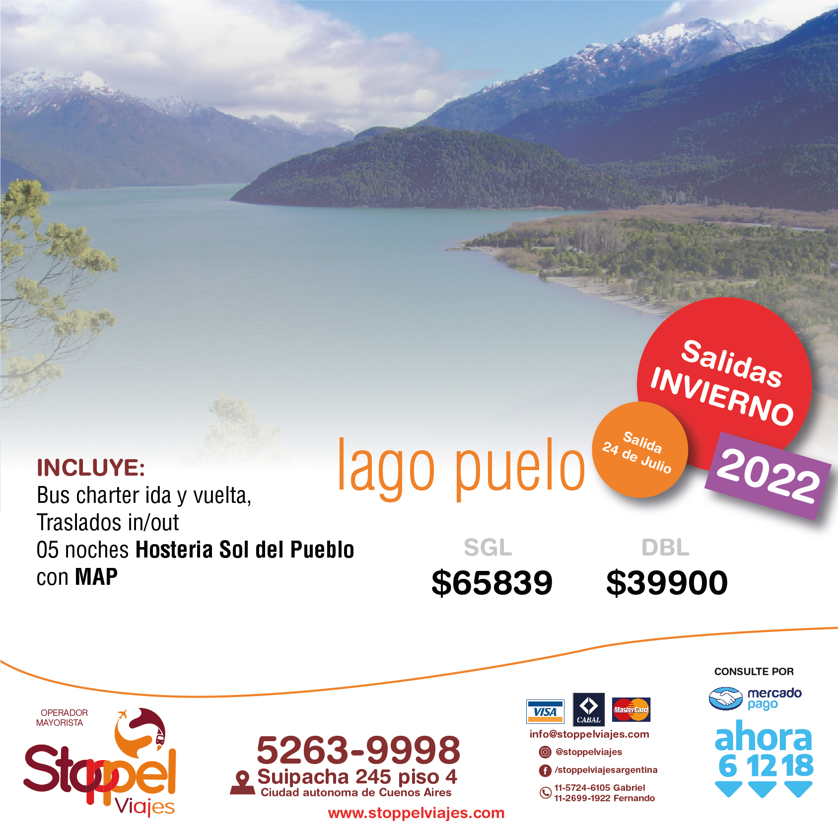 No incluyen: IVA e impuestos (INC) aéreos que deberán adicionarse al valor de los paquetes como asi tampoco las tasas de los aeropuertos de Ushuaia y Calafate que deberan abonarse en destino. En el caso de paquetes en bus son tarifas finales. Ofertas validas hasta agotar el cupo de 10 plazas por destino por salida.